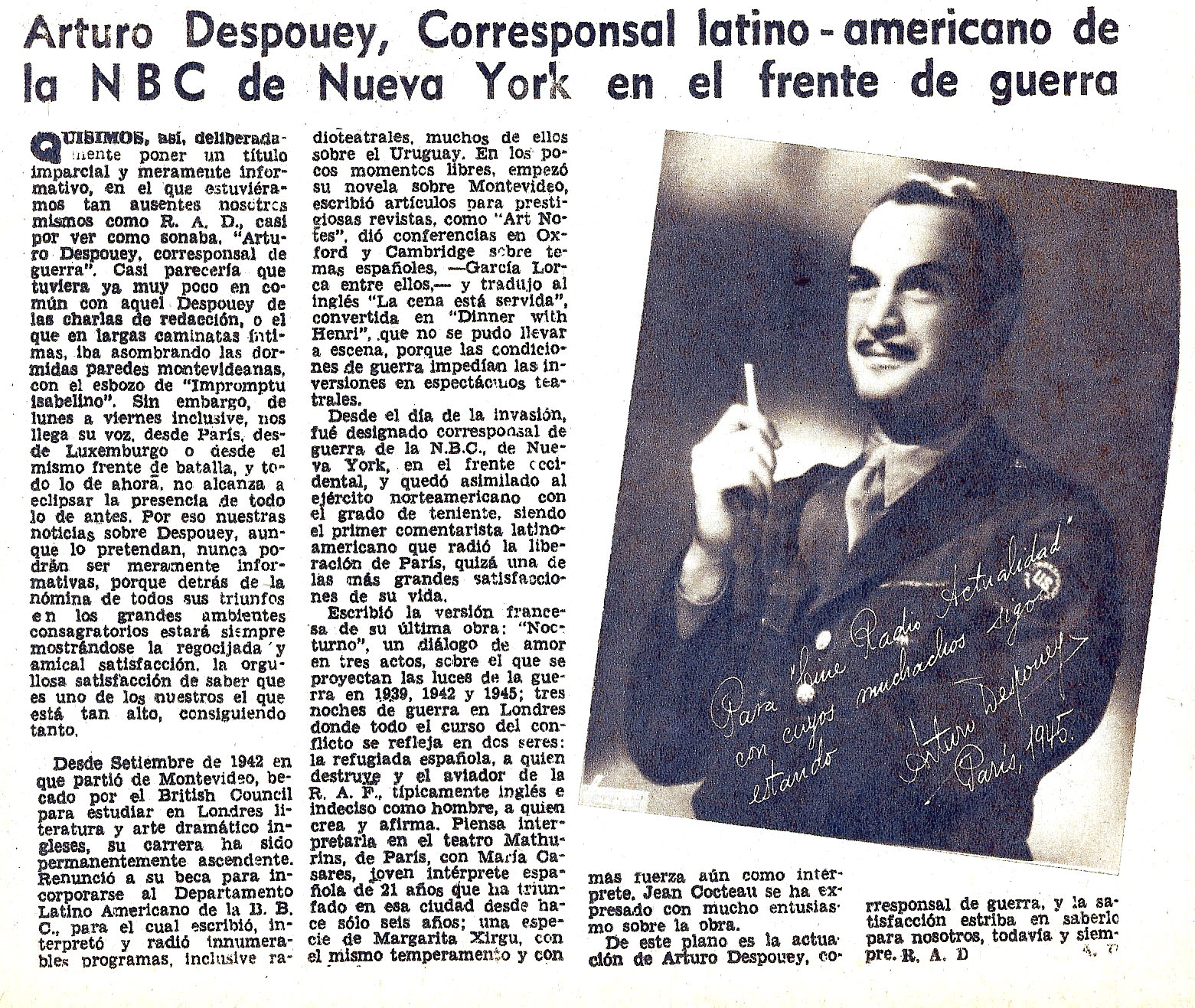 En Cine Radio Actualidad. Luego de su alejamiento, se publicaron tres notas en torno a la figura de Arturo Despouey y a la tarea que por esos años (1944 y 1945) desempeñaba, como corresponsal de guerra para la agencia de prensa internacional NBC. La primera voz castellana que trasmitió desde París liberado para América, fue la del Teniente Americano Arturo Despouey 22 de setiembre de 1944, Año IX, Nº 428. Sin firma. Sobre R. Arturo Despouey, Homero Alsina Thevenet, MARCHA, N° 280, 4 de mayo de 1945. R. ARTURO DESPOUEY visto con lentes ahumados. Mayo de 1945, Año X, Nº 461. Firma: HRA. Montevideo en Despouey MARCHA, Nº 305, 19 de Octubre de 1945. Sin Firma Arturo Despouey, Corresponsal latino-americano de la NBC de Nueva York en el frente de guerra. En Cine Radio Actualidad, 1937 (Archivo PDF y JPG 1561 × 1317) R. ARTURO DESPOUEY En MARCHA. Montevideo, Año XII, nº 574, viernes 4 de mayo de 1951, pág. 13. Transcripción: Arturo Rodríguez. Carlos Real de Azúa: Extracto de Antología del ensayo uruguayo. Tomo II Departamento de Publicaciones de la Universidad de la República, Montevideo, 1964, págs. 404-407. (Ir al sitio de Carlos Real de Azúa) Alberto Paganini. Extracto de Los críticos del 45. Capítulo Oriental Nº 35, Montevideo, CEDAL, 1969, pág. 556. Decreto departamental donde se designa el nombre Arturo Despouey a una calle de Montevideo. Art. 6º del Decreto 17.118 del 22 de setiembre de 1975. R. Arturo Despouey : “Príncipe del espíritu, señor de la amistad” Declaraciones de Carlos Mezzera en CORREO DE LOS VIERNES, 10/09/1982, p. 12. Transcripción: Silvia Sánchez. Hugo Alfaro (H.Al.) Diccionario de literatura uruguaya A-K. III vol. (Dir.: Alberto F. Oreggioni). Arca/Credisol publicaciones, Montevideo, 1987. Págs. 185-186 Imagen, memoria y palabra. Vida y obra de Arturo Despouey por Ángeles Blanco. Monografía para el Seminario-taller de Análisis de la Comunicacción, 2 de diciembre de 2003. Genio y figura de R. Arturo Despouey EL PAÍS CULTURAL, nº 752, Montevideo, 2 de abril de 2004, pp. 8-9, por Ángeles Blanco UNA ENTREVISTA A ASDRÚBAL SALSAMENDI SOBRE ARTURO DESPOUEY, SU FAMILIA Y SU TIEMPO Transcripción de dos entrevistas telefónicas colectivas con Salsamendi, residente en España, mantenidas entre julio y agosto de 2005. La desgrabación fue realizada por la Lic. Gelsi Ausserbauer. Arturo Despouey. Artista y Crítico Por Hugo Rocha. Montevideo, 2009. Un dandy en la guerra. El manuscrito Despouey Por Carlos María Domínguez, en El País Cultural, Montevideo, 29 de junio de 2012. Genio y figura de R. Arturo Despouey Por Ángeles Blanco, en el sitio web Henciclopedia, s. f. (publicado originalmente en El País Cultural, Nº 752, como extracto de una monografía académica sobre la vida y la obra de Arturo Despouey). Las generaciones críticas (pags.7-12) Link directo a la revista digital Tercer Film Nº1, por Revista Film, edición septiembre/octubre de 2014. El ambicioso proyecto de la BBC de llevarle al mundo la primera versión radiofónica del Quijote en 1947, BBC Mundo, 16 de marzo de 2018. Prólogo de Eduardo Ferreira a la novela de Arturo Despouey, SANTUARIO DE EXTRAVAGANCIAS. Se incluye la tapa de la obra. Transcripción: Sebastián Suárez. (Ir al sitio de Eduardo Ferreira) (Texto Completo de la novela) Dirigida por R. Arturo Despouey se inicia hoy la audición "Canal de la Mancha". Artículo en Cine Radio Actualidad s/d. (Aporte de Leopoldo Martinez) LA MEJOR PIEZA DE DESPOUEY. por Hugo Rocha. Prólogo a “Música del Siglo XX”, s/f. Un lenguaje de púrpuras y zarazas. Anotaciones de Isidra Solari sobre la palabra “zaraza”, s/f. |