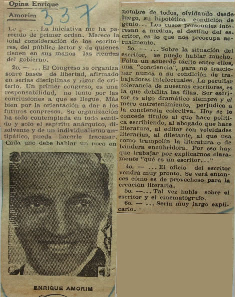Contestación de Amorim a encuesta relacionada con el Primer Congreso Gremial de Escritores de Argentina organizado por la Sociedad Argentina de Escritores, a iniciarse el 12 de noviembre de 1936.