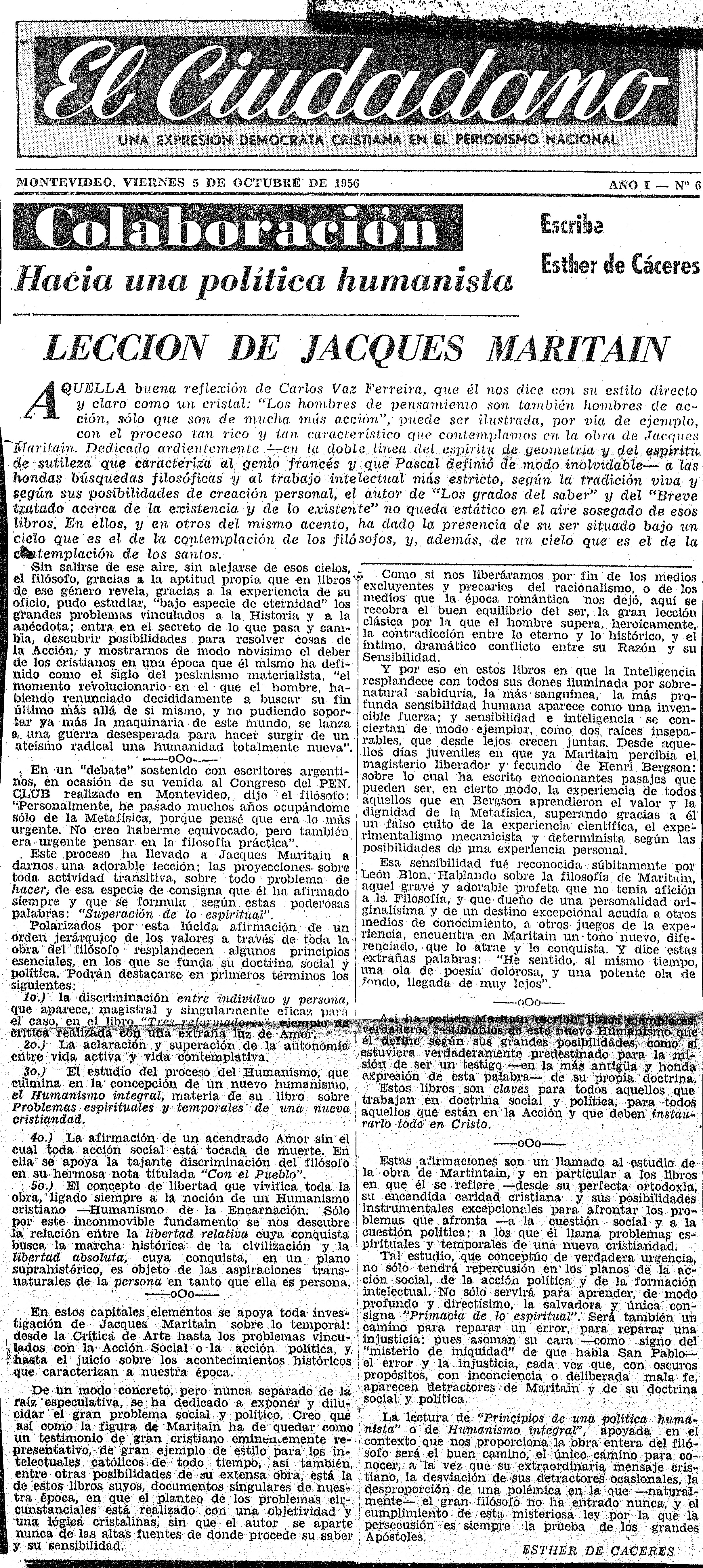 Lección de Jacques Maritain El Ciudadano, Año I, nº 6, Montevideo, 5 de Octubre de 1956.