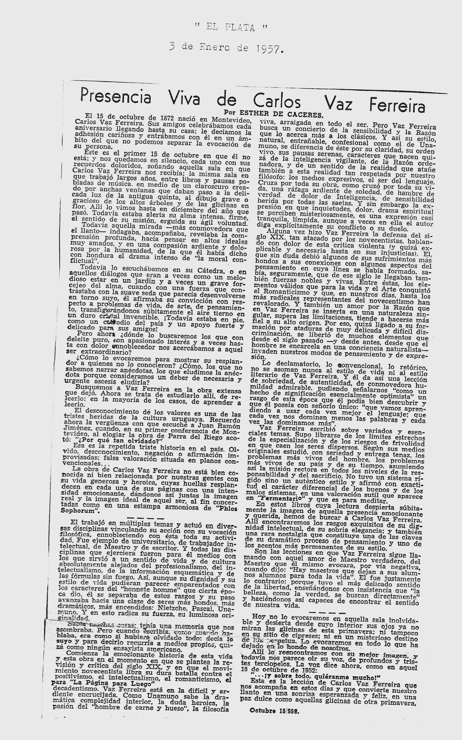 Presencia viva de Carlos Vaz Ferreira El Plata, Montevideo, 3 de Enero de 1957.