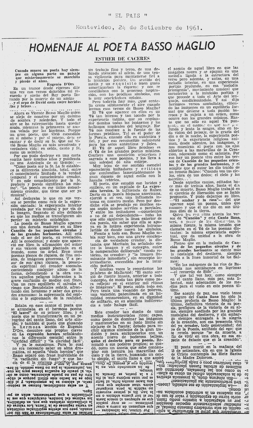 Homenaje al poeta Basso Maglio El País, Montevideo, 24 de Setiembre de 1961.