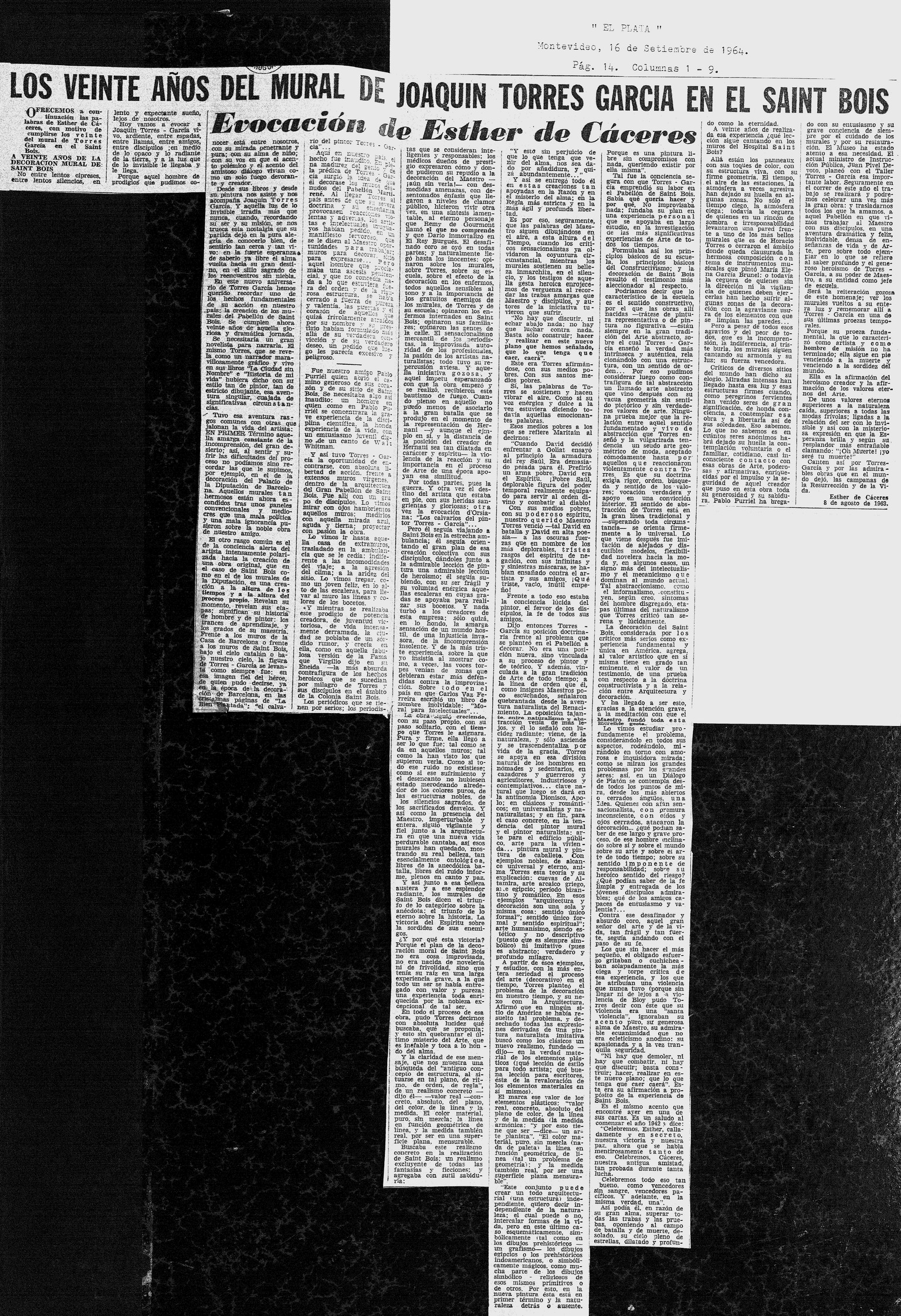 Los veinte años del mural de Joaquín Torres García en el Saint Bois El Plata, Montevideo, 16 de Setiembre de 1964, Pág. 14.