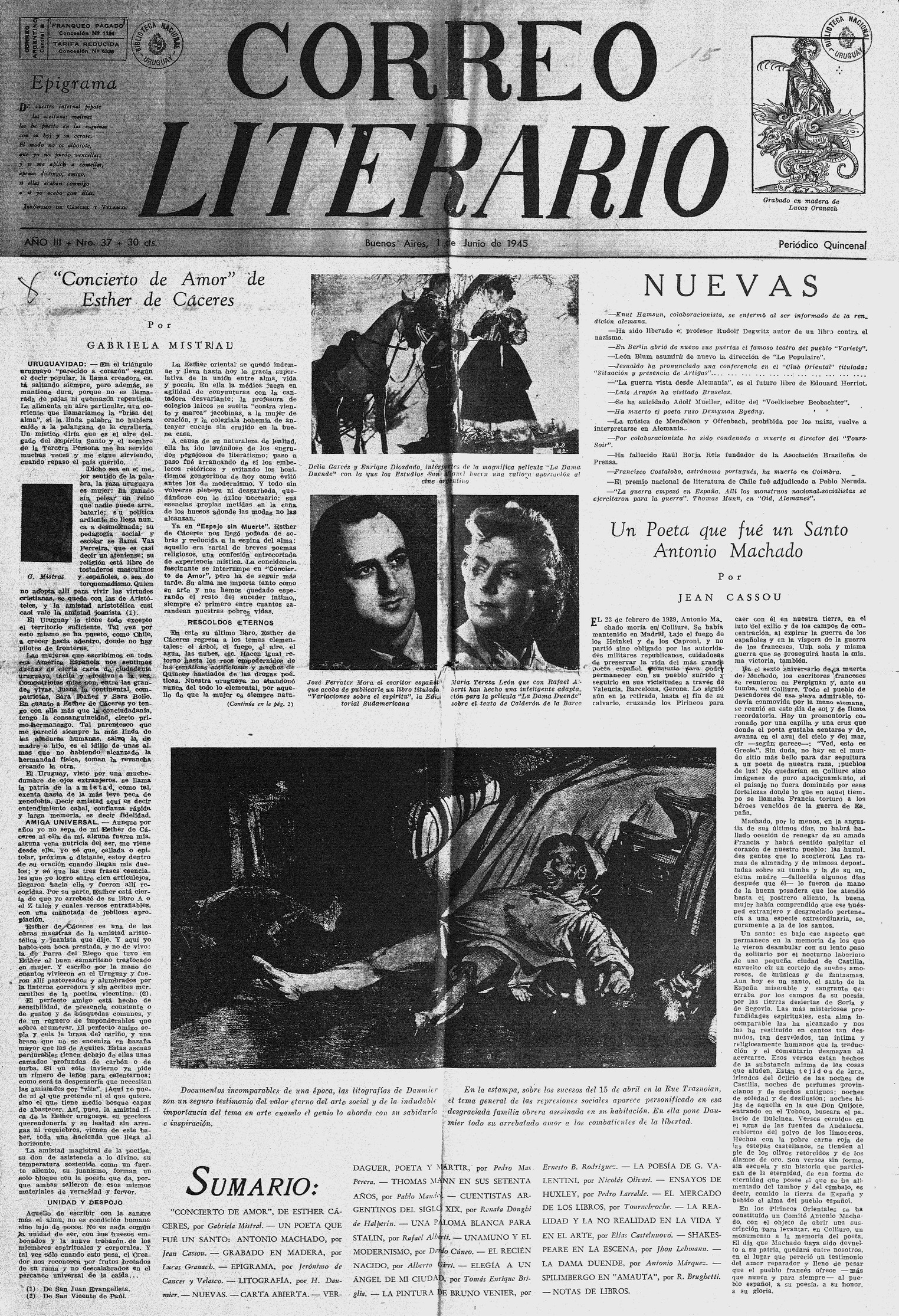 "Concierto de Amor" de Esther de Cáceres MISTRAL, Gabriela. Correo Literario. Buenos Aires, 1 de Junio de 1945