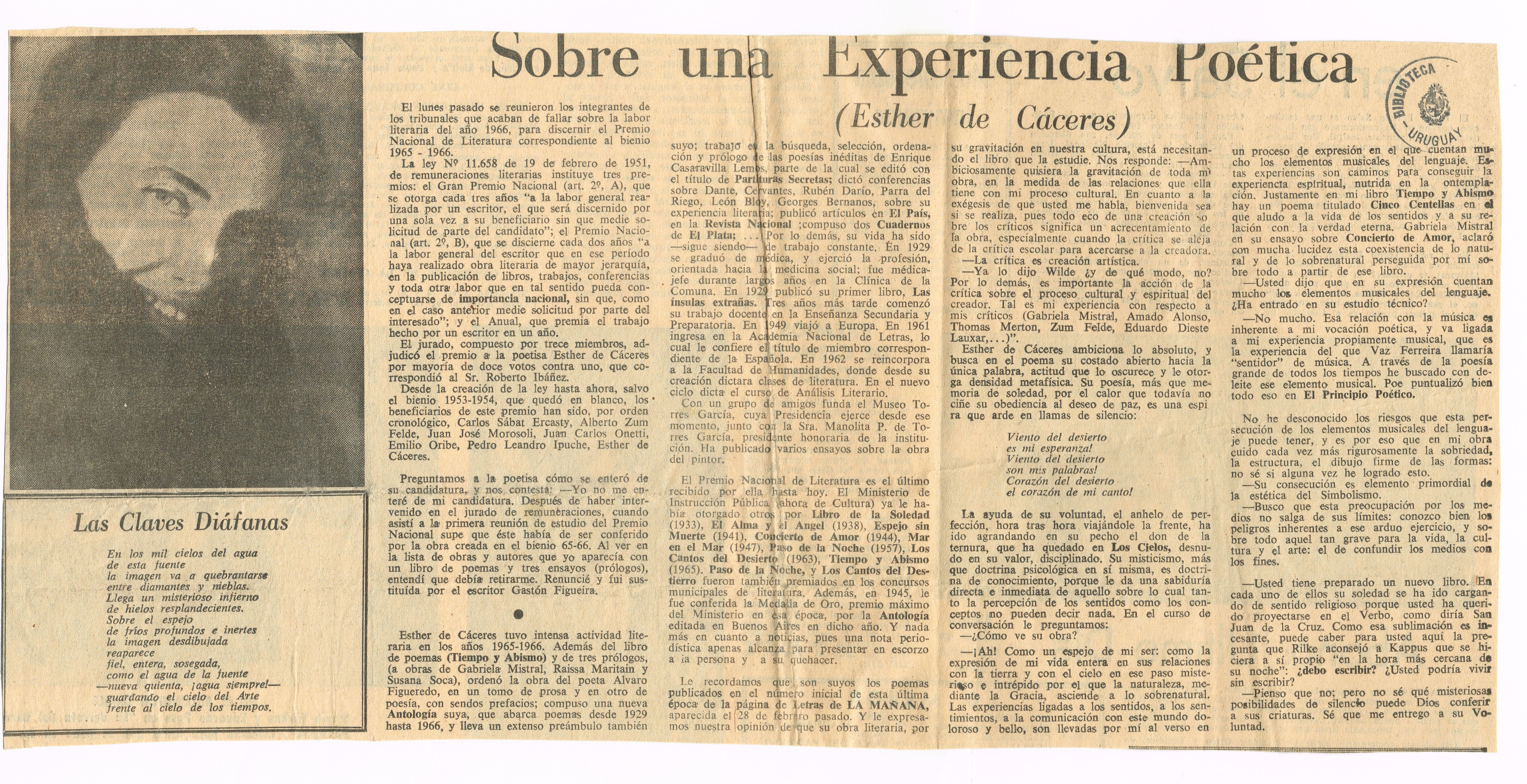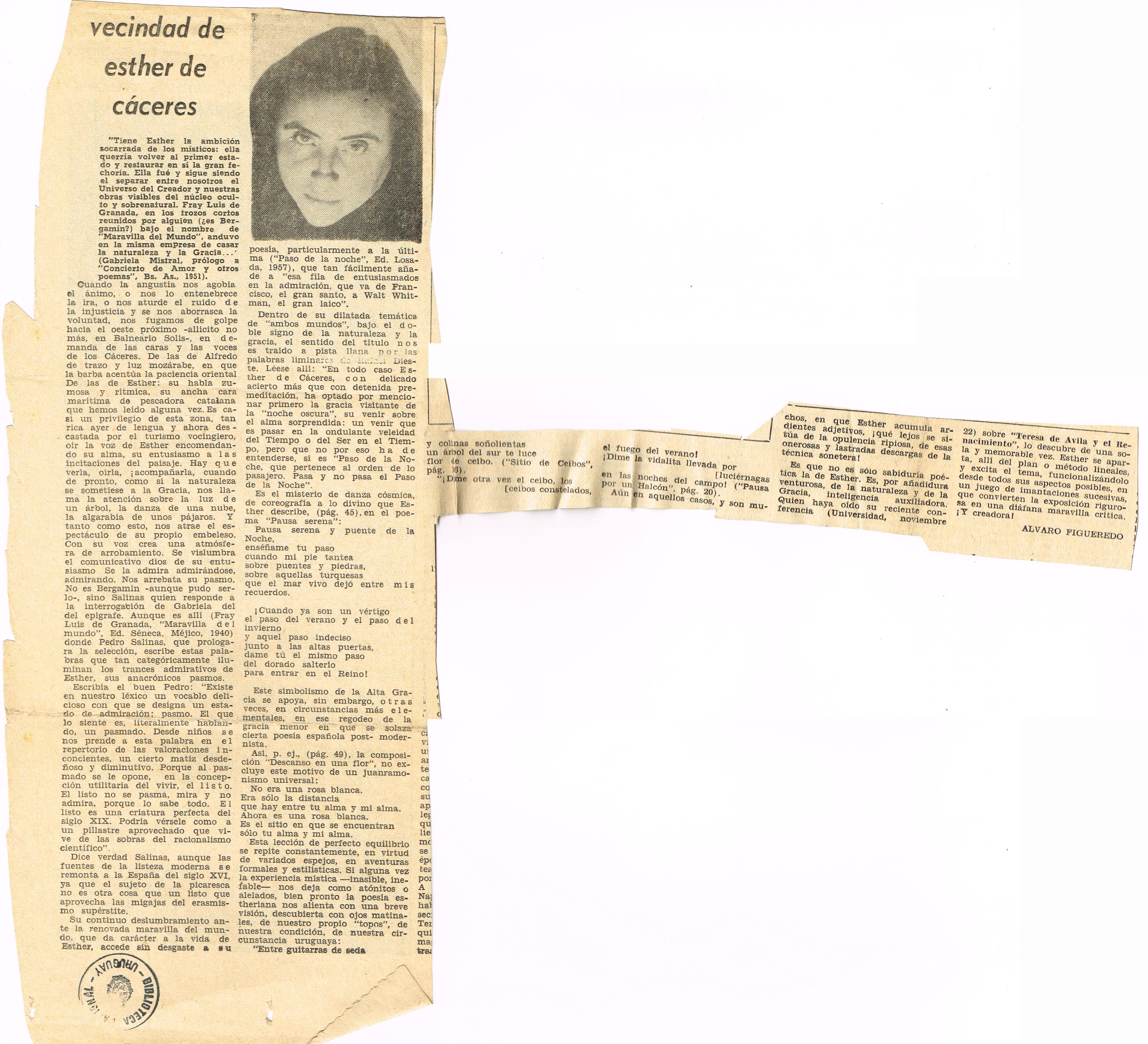 Esther de Cáceres, Poetisa de la unidad de lo místico, lo poético y lo musical El Bien Público, Montevideo, 30 de Abril de 1954