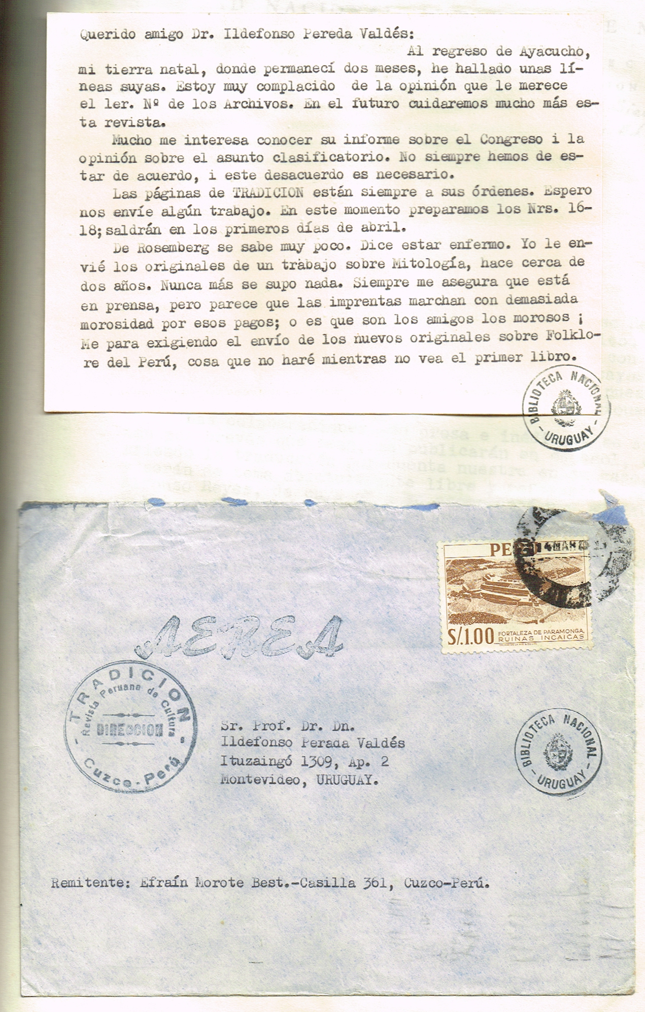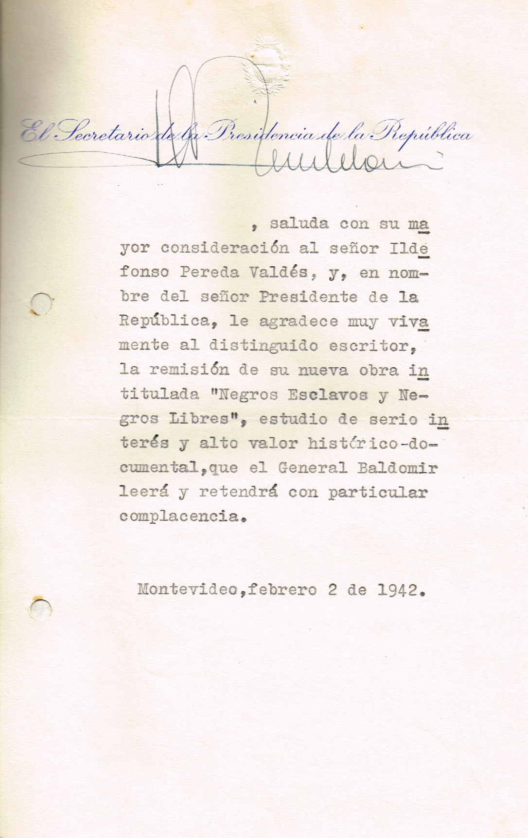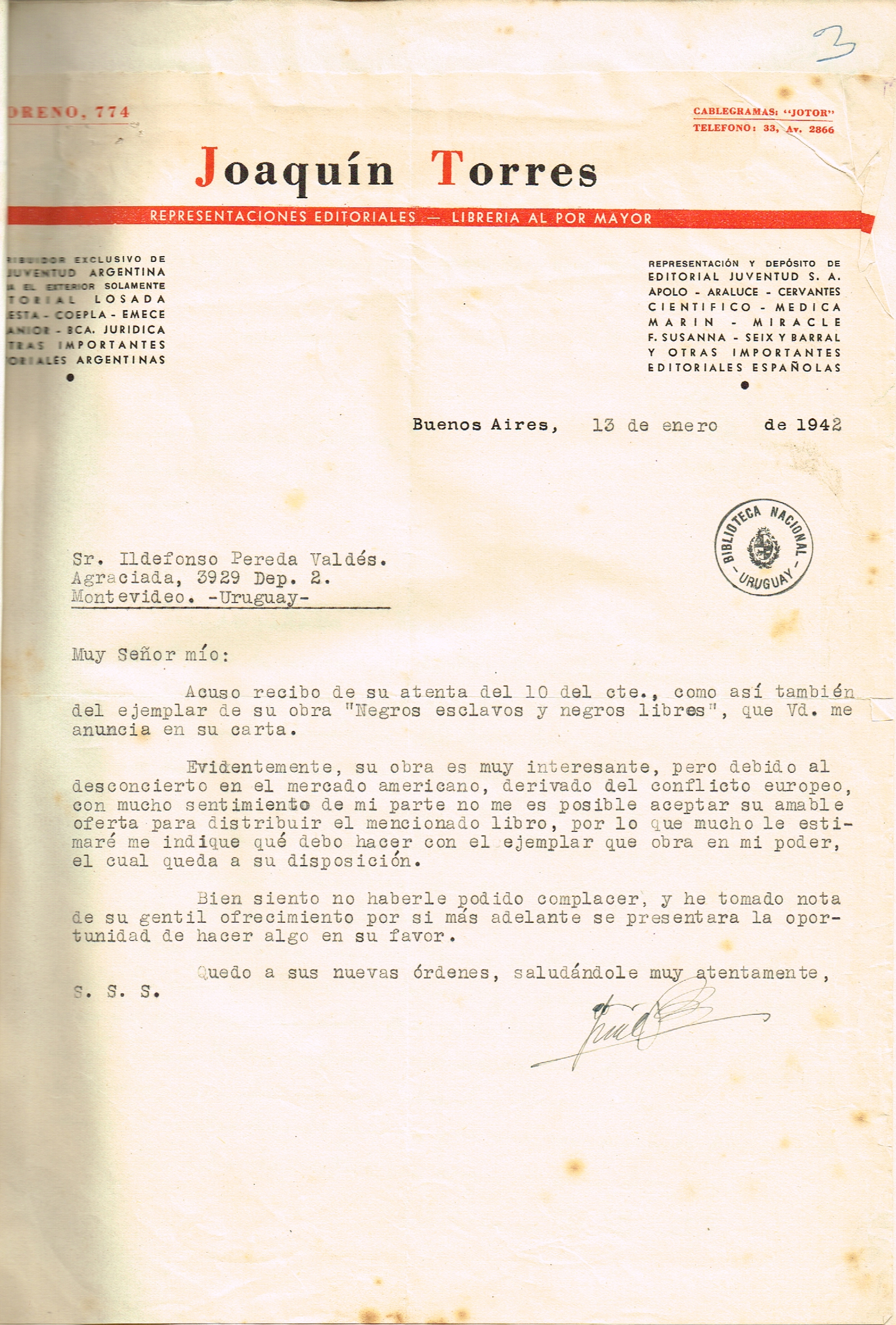 DocumentosCarta enviada por Pedri Figari desde París, Francia el 10 de Setiembre de 1926 Leer Carta enviada por Jacobo Mazaré invitando a Pereda Valdés a formar parte del proyecto de la revista Vórtice, con fecha próxima a 1922 Leer (Parte 1) - Leer (Parte 2) Carta enviada por Pedro Figari desde París, Francia el 19 de Abril de 1936. Leer Carta enviada desde el Departamento de Estado de Washington convocándolo a una conferencia a realizarse en Abril de ese año, 6 de Enero de 1942 Leer Carta de la Editorial Joaquín Torres rechazando petición de distribución de un texto del autor, Buenos Aires, Argentina, 12 de Enero de 1942 Leer Carta del Secretario del Presidente de la República solicitando ejemplar de Negros esclavos y negros libres para la lectura del entonces presidente Gral. Alfredo Baldomir, Montevideo 2 de Enero de 1942 Leer Postal enviada por el escritor Juan Marín desde El Cairo, Egipto con fecha del 30 de setiembre de 1947 Leer Carta enviada por Marcelino Arozarena al autor desde La Habana, Cuba con fecha del 2 de Junio de 1955 Leer Carta de Ileka Allende al autor desde Santiago de Chile, del 3 de Diciembre de 1955 Leer Carta enviada por Jaime García Terres, de la Universidad Nacional Autónoma de México, invitando al autor a formar parte de los integrantes de un homenaje al 50º aniversario del ejercicio literario público de Alfonso Reyes, 22 de Marzo de 1955 Leer Postal enviada por el escritor Juan Marín desde Nueva Delhi, India sin fecha indicada Leer Carta enviada por el folclorista peruano Efraín Morote, sin fecha indicada Leer |