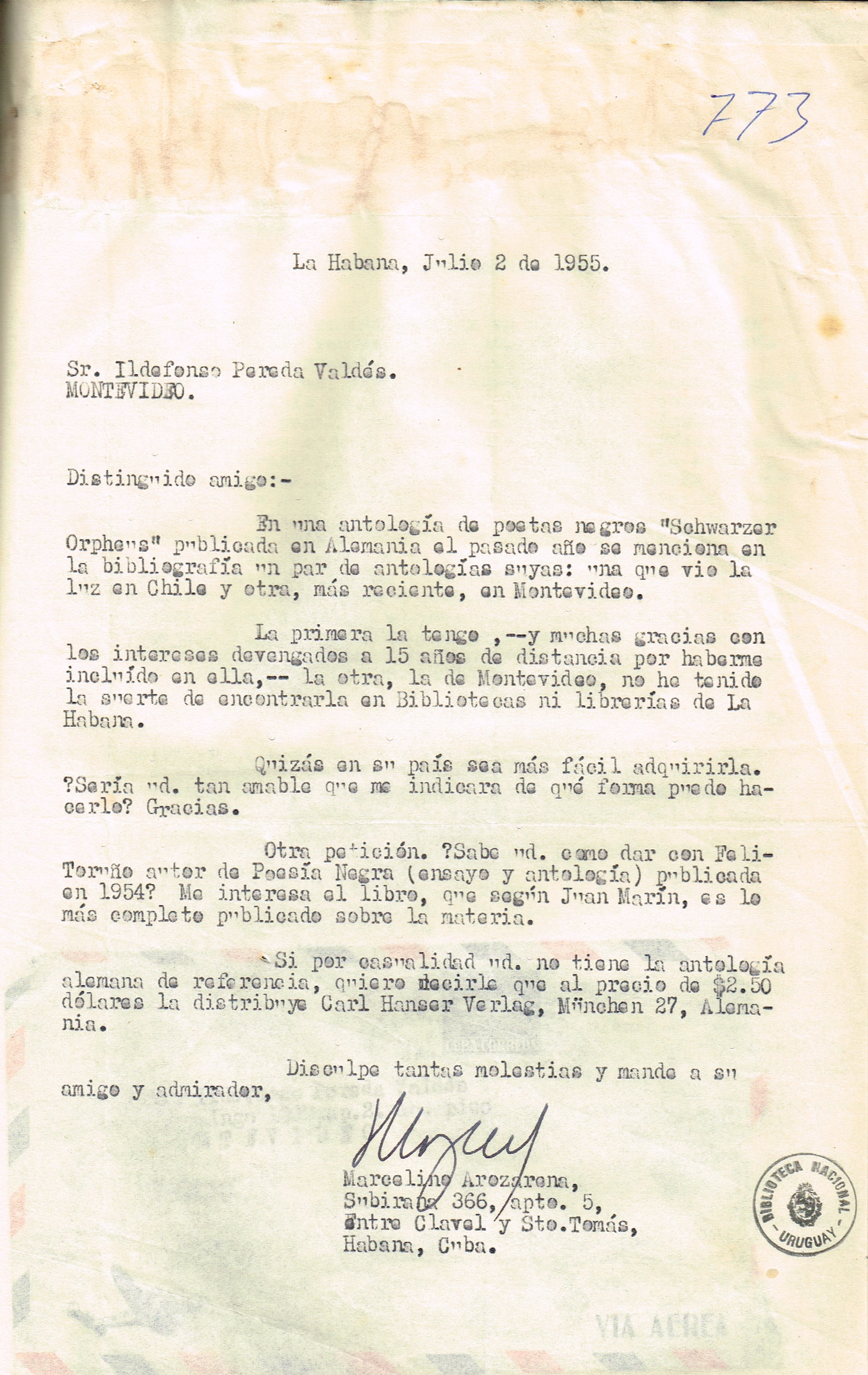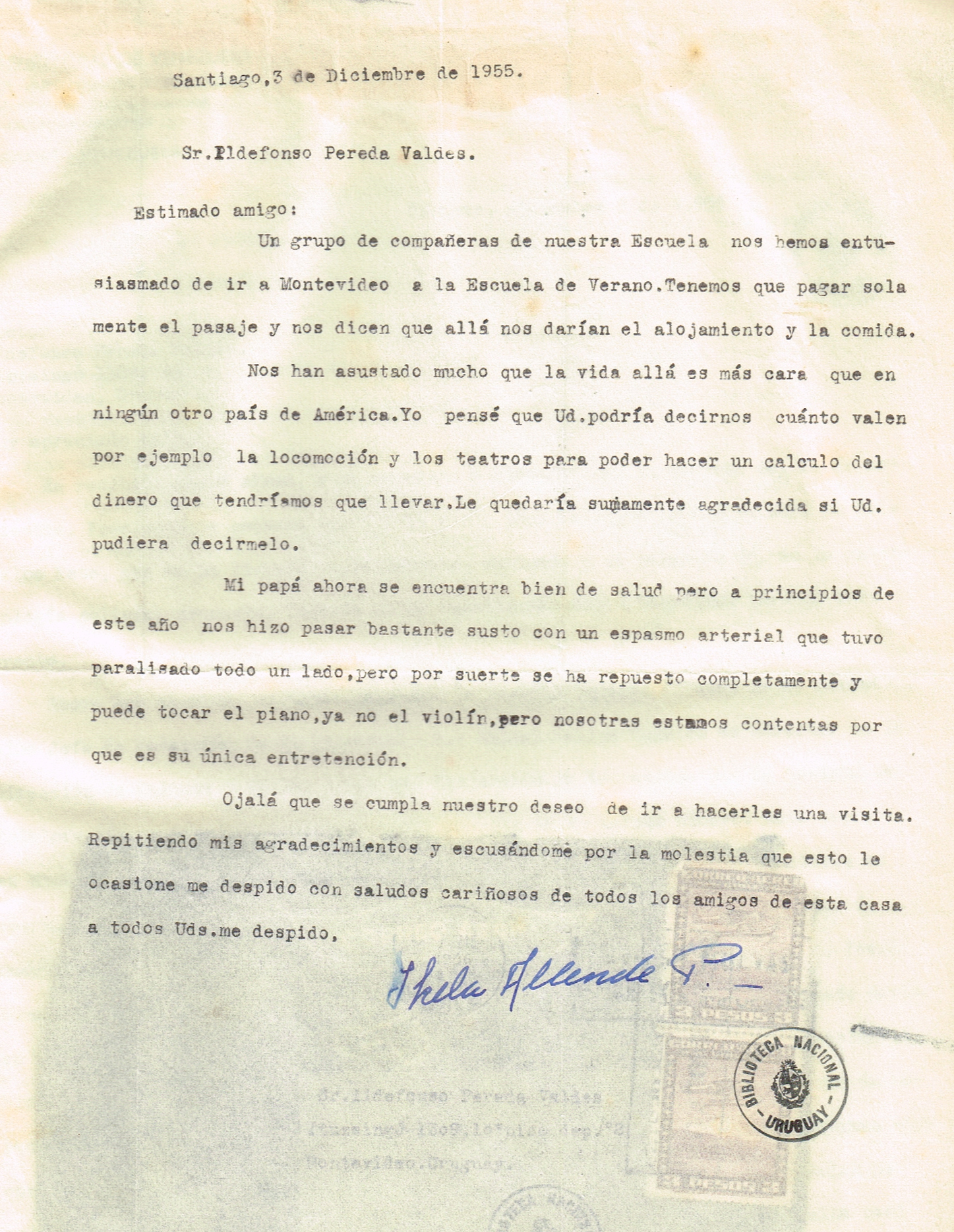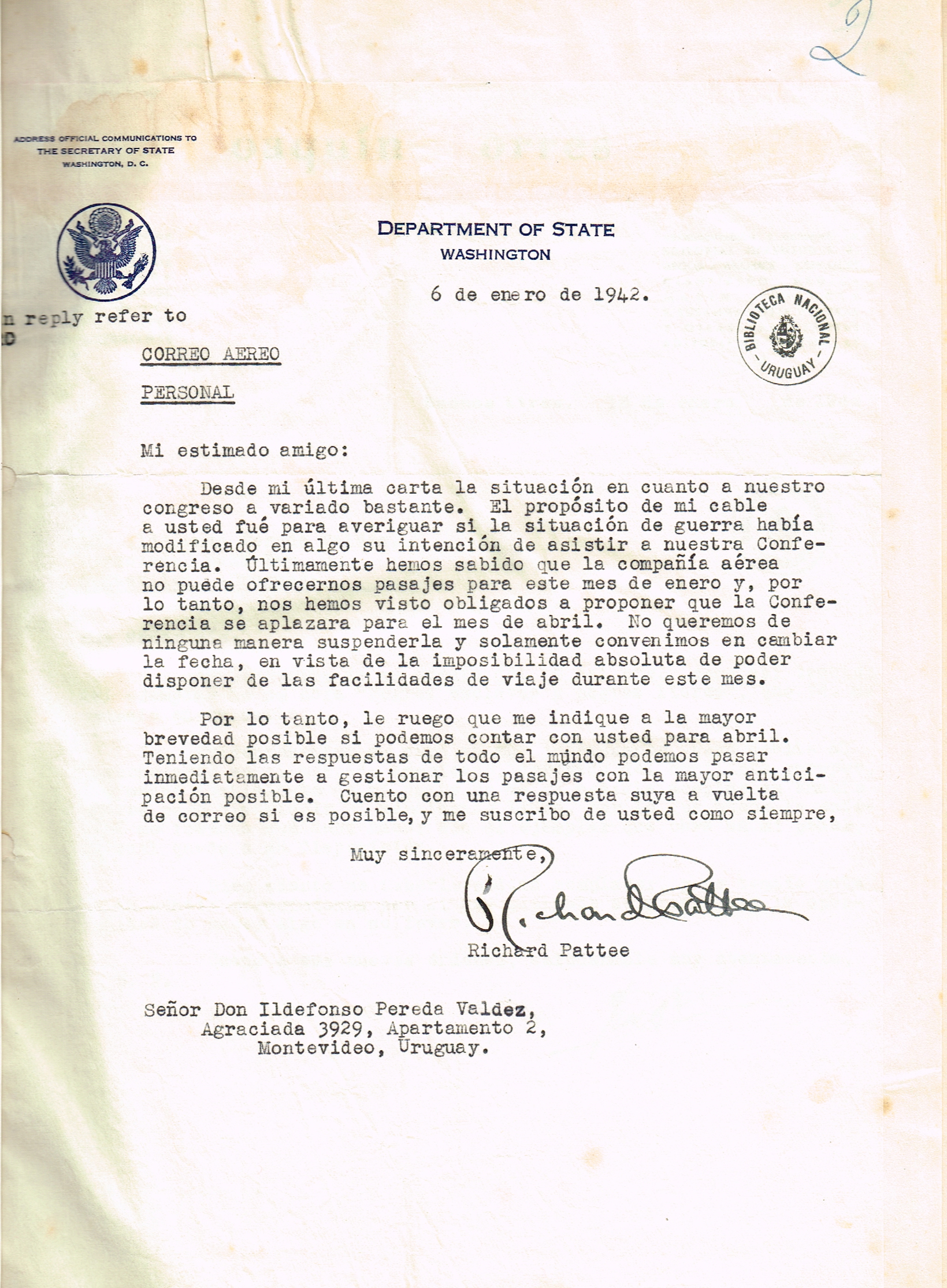 DocumentosCarta enviada por Pedri Figari desde París, Francia el 10 de Setiembre de 1926 Leer Carta enviada por Jacobo Mazaré invitando a Pereda Valdés a formar parte del proyecto de la revista Vórtice, con fecha próxima a 1922 Leer (Parte 1) - Leer (Parte 2) Carta enviada por Pedro Figari desde París, Francia el 19 de Abril de 1936. Leer Carta enviada desde el Departamento de Estado de Washington convocándolo a una conferencia a realizarse en Abril de ese año, 6 de Enero de 1942 Leer Carta de la Editorial Joaquín Torres rechazando petición de distribución de un texto del autor, Buenos Aires, Argentina, 12 de Enero de 1942 Leer Carta del Secretario del Presidente de la República solicitando ejemplar de Negros esclavos y negros libres para la lectura del entonces presidente Gral. Alfredo Baldomir, Montevideo 2 de Enero de 1942 Leer Postal enviada por el escritor Juan Marín desde El Cairo, Egipto con fecha del 30 de setiembre de 1947 Leer Carta enviada por Marcelino Arozarena al autor desde La Habana, Cuba con fecha del 2 de Junio de 1955 Leer Carta de Ileka Allende al autor desde Santiago de Chile, del 3 de Diciembre de 1955 Leer Carta enviada por Jaime García Terres, de la Universidad Nacional Autónoma de México, invitando al autor a formar parte de los integrantes de un homenaje al 50º aniversario del ejercicio literario público de Alfonso Reyes, 22 de Marzo de 1955 Leer Postal enviada por el escritor Juan Marín desde Nueva Delhi, India sin fecha indicada Leer Carta enviada por el folclorista peruano Efraín Morote, sin fecha indicada Leer |
