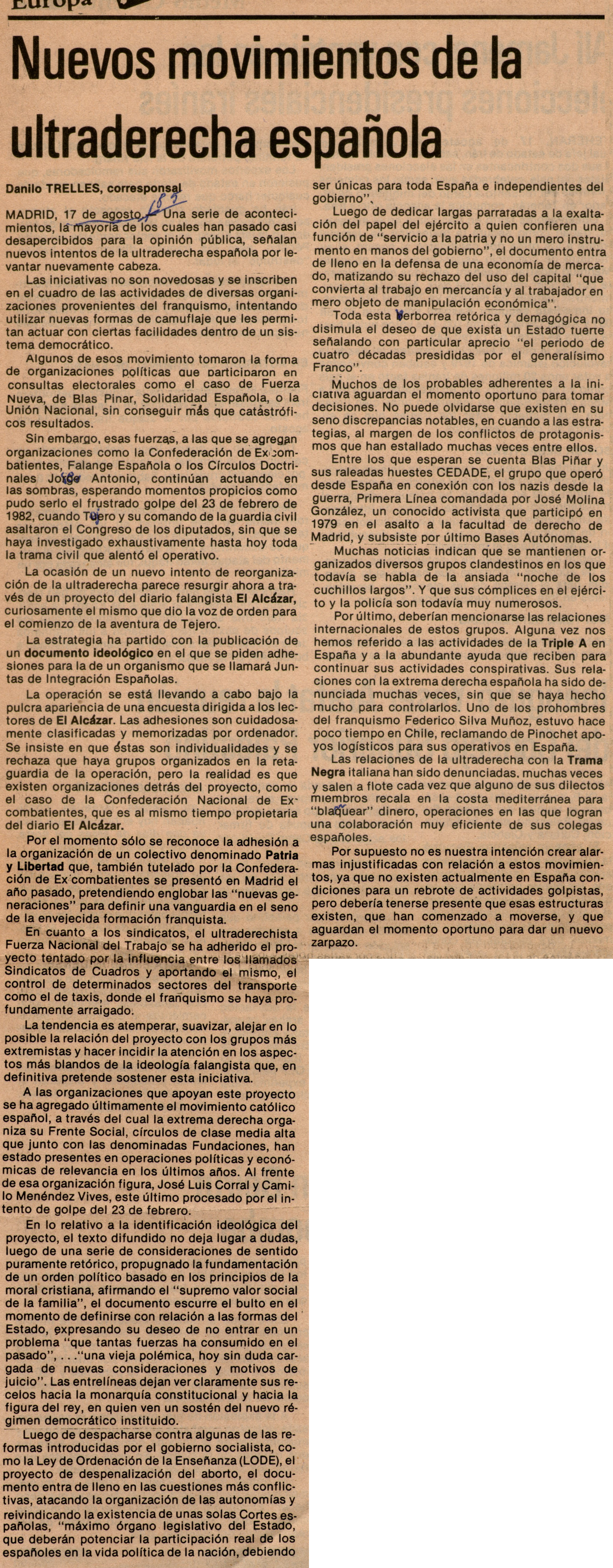 1985.08.17. Nuevos movimientos de la ultraderecha española.